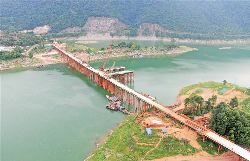 據悉,2#鋼棧橋的順利合龍,加強了皂市水庫兩岸人力、物資等建設資源的高效配置,是該段工程高質量建設的“生命線”。面對環保要求高、建設工期緊、汛期施工難度大的嚴峻形勢,全體參建人員切實提高政治站位、強化大局意識,積極克服各種不利因素影響,有效確保了施工建設按期推進:一是把安全擺在首位,優化汛期施工方案及應急預案;二是強化監督考核,注重過程控制,進行技術交底;三是優化施工組織,提升建設效率,充分展開工作面,組織鋼棧橋兩端同步施工;四是反復推敲、多管齊下,破除技術難題,針對陡坡無覆蓋層硬巖深水基礎施工環境,采用“沖擊鉆鑿平+鋼管樁插打+地質鉆錨固”的方式,實現了樁基的順利施工。